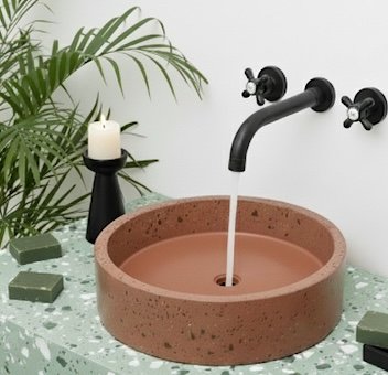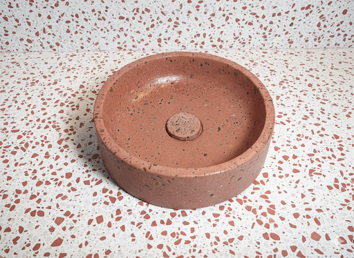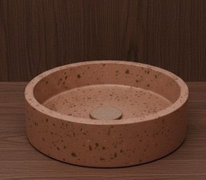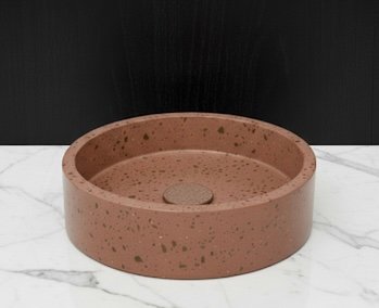 Bacha de terrazo ovalada color terracota, medida 40 cm. Diseño moderno y resistente, ideal para baños elegantes con estilo natural y contemporáneo.