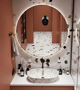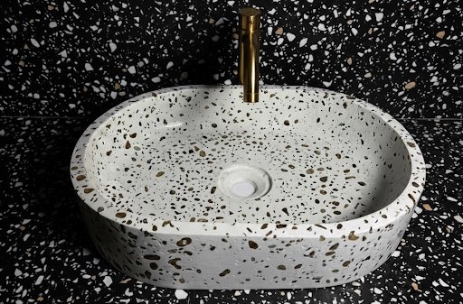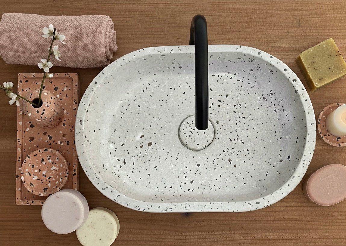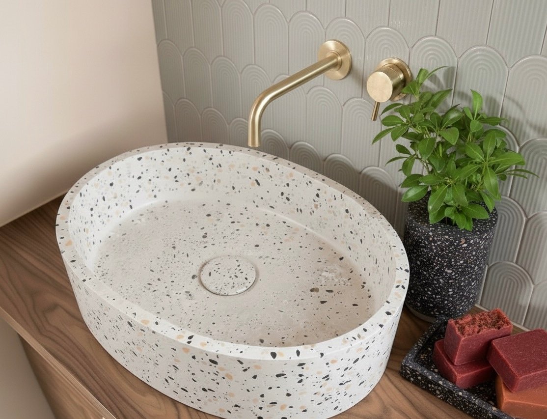 Bacha de apoyo ovalada de 52x38x10cm en terrazo color natural con piedras en tonos marrones, rojizos y negros.